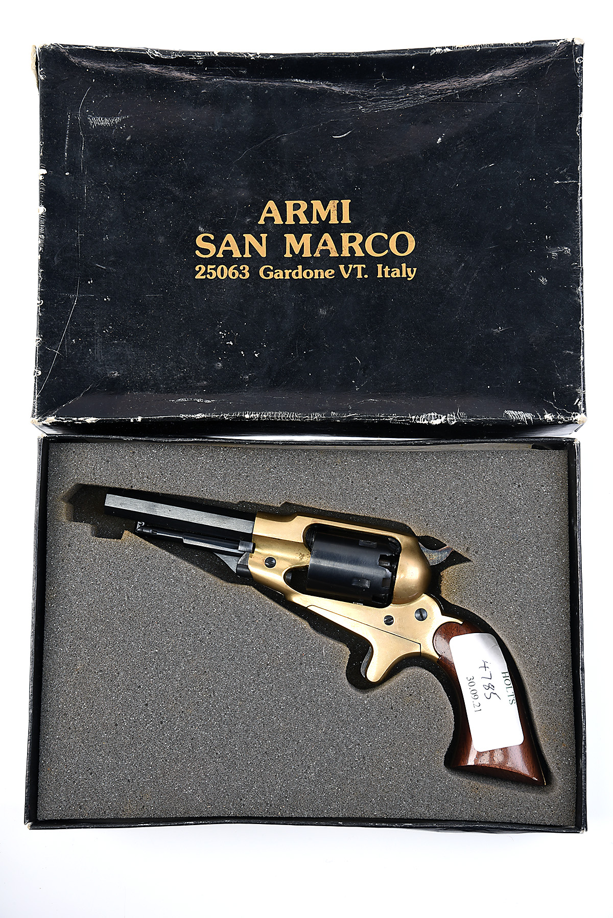 A BOXED REPRODUCTION .31 PERCUSSION POCKET-REVOLVER SIGNED ARMI SAN MARCO, MODEL 'REMINGTON POCKET', serial no. A64225, with blued octagonal 3 1/2in. barrel, brass solid frame, plain blued cylinder and smooth walnut grips, in its maker's card carton appearing little used