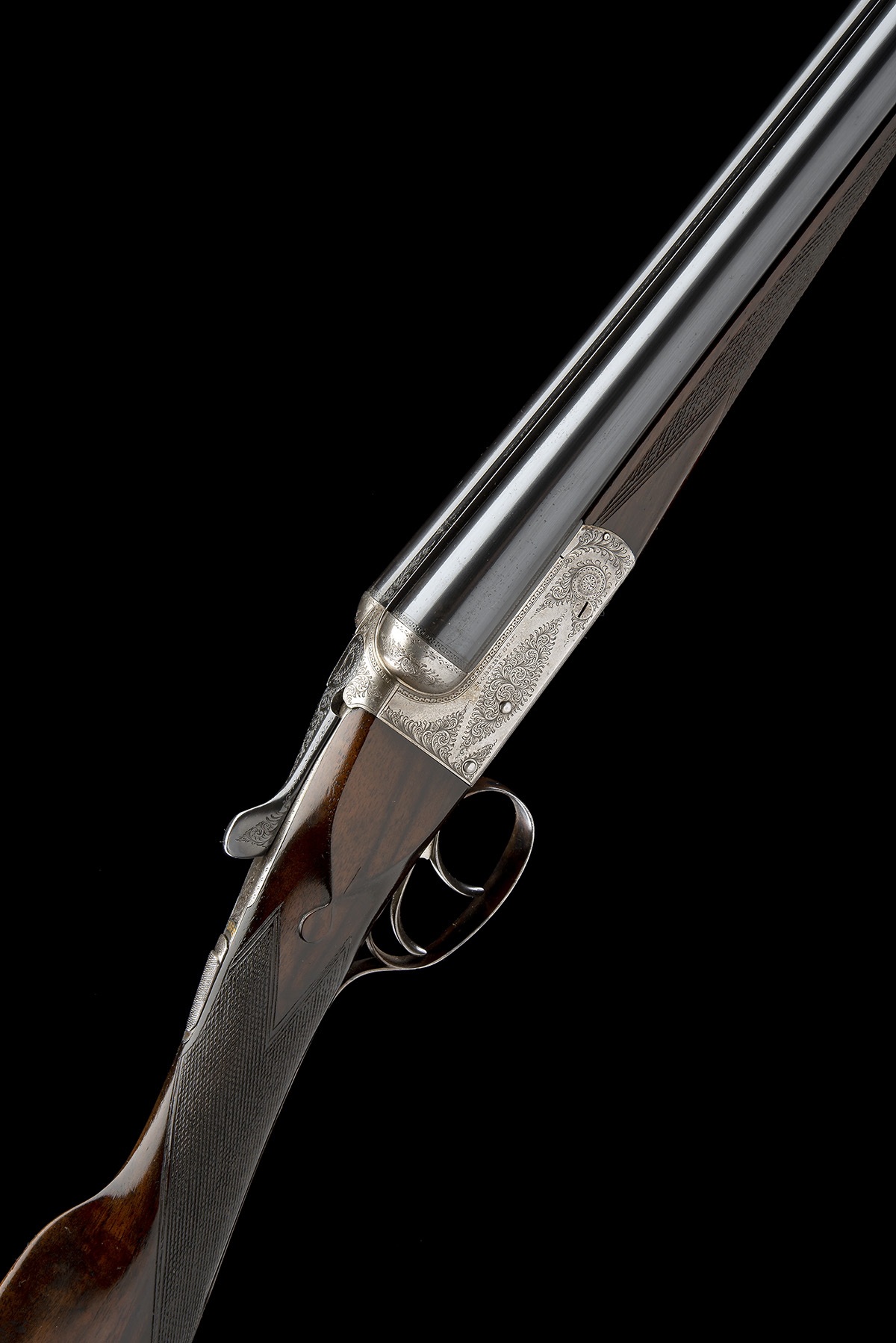 circa 1924, 27in. replacement nitro barrels (in 1976), the rib engraved 'NEW BARRELS BY B.E. CHAPLIN (GUNMAKERS) LTD. WINCHESTER', 2 1/2in. chambers, bored approx. 1/4 and 1/2 choke, automatic safety with gold-inlaid 'SAFE' detail, beaded border and acanthus scroll engraving, brushed and reblued finish overall, 14 5/8in. stock (minor setting crack at top tang) including 1 5/8in. wooden extension, weight 5lb. 7oz.