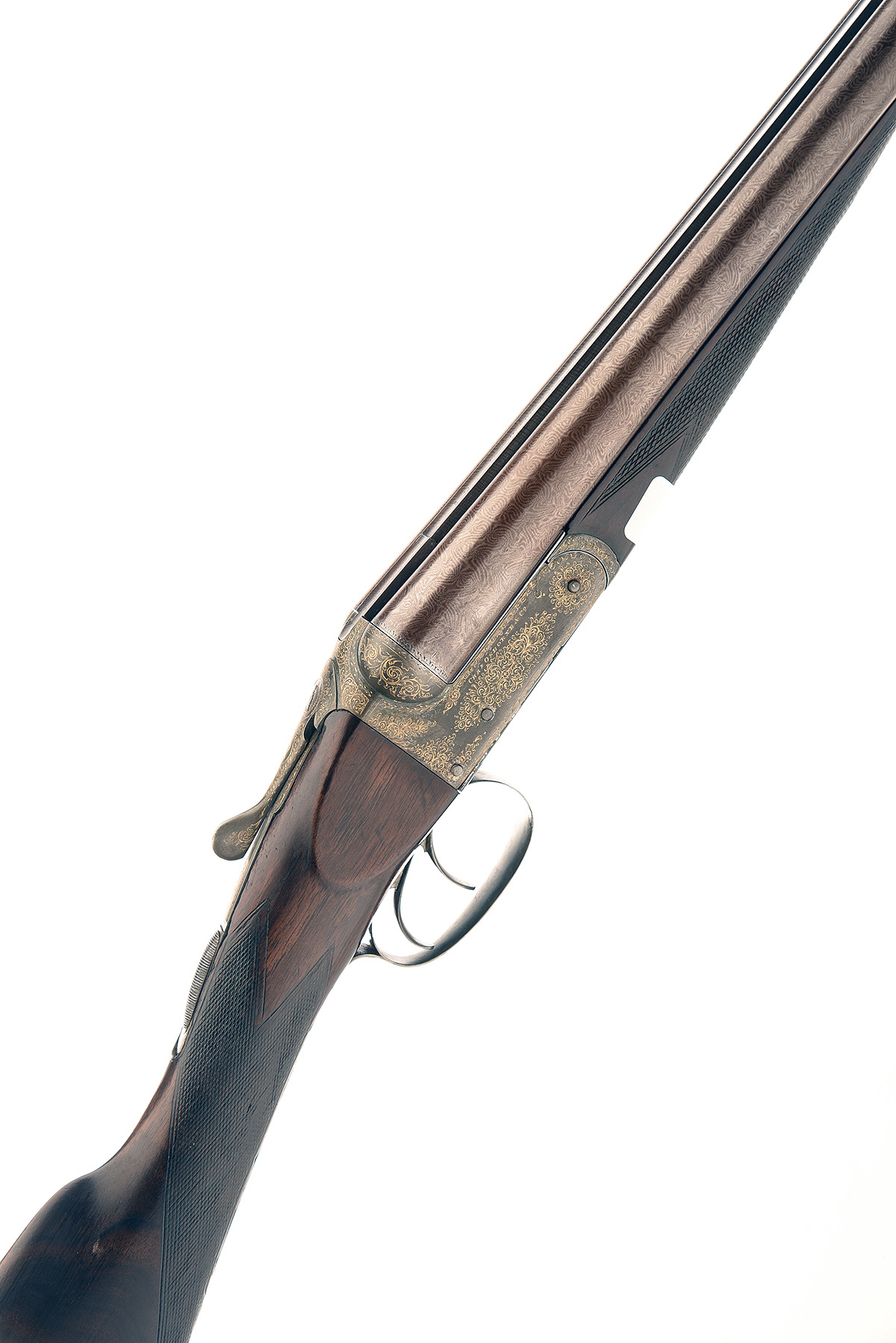 CHAS OSBORNE & CO. 12-BORE BOXLOCK EJECTOR, serial no. 27104, circa 1892, 30in. nitro reproved damascus barrels (in 1969, left tube measurements marginal and left wall at 14), 2 1/2in. chambers, bored approx. true cyl. and 1/2 choke, treble-grip action, automatic safety, border and acanthus scroll engraving with gilt-coloured infill, 14 1/2in. stock, weight 6lb. 6oz.