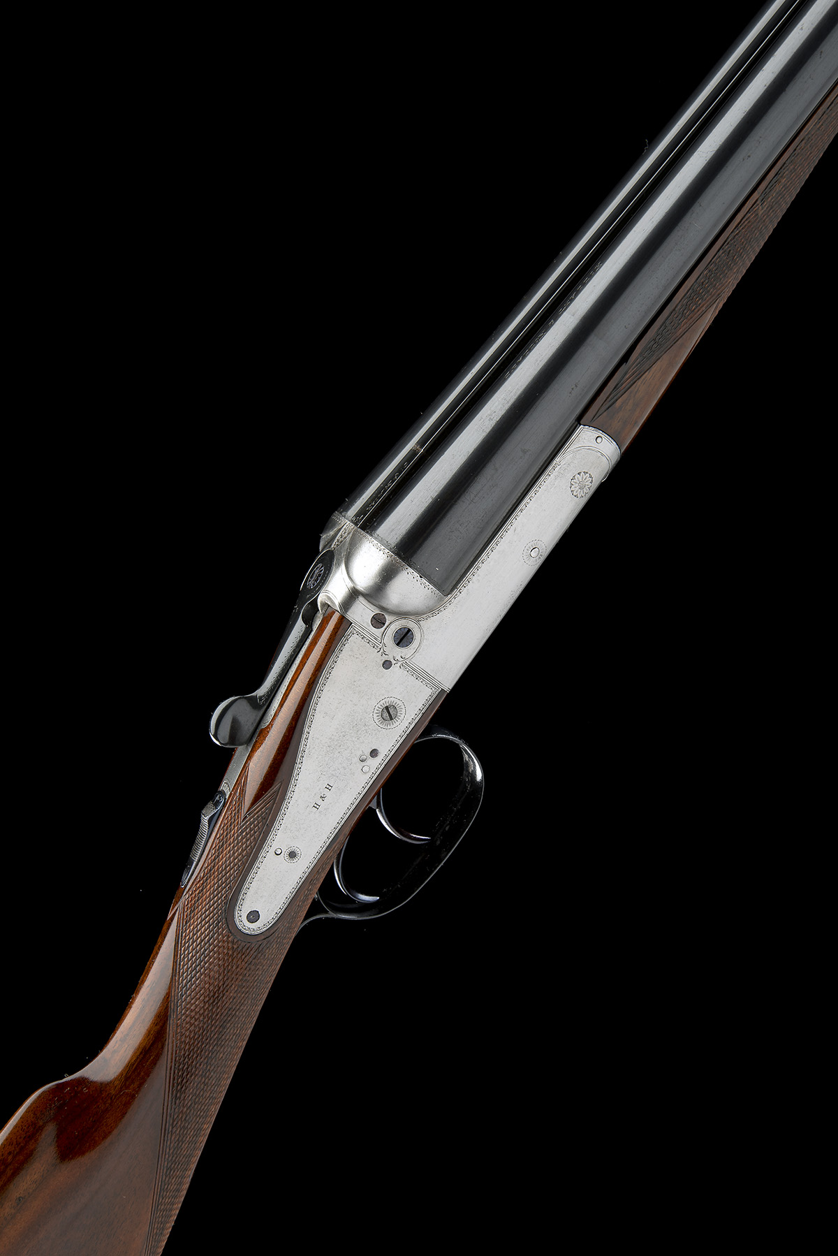 circa 1910, 28in. sleeved nitro barrels (in 2011), the tubes re-engraved 'HOLLAND & HOLLAND. 98. NEW BOND STREET. LONDON.', the rib re-engraved 'C GRADE' at the breech end, 2 3/4in. chambers, bored approx. true cyl. and 1/4 choke, action with patent gas checks, automatic safety with engraved 'SAFE' detail, cocking-indicators, border engraving, the lockplates signed 'H & H', brushed bright and reblued finish overall, 14 1/2in. replacement stock including 3/8in. buttplate, fore-end with Deeley & Edge patent release and replacement wood, weight 6lb. 13oz., in a leather hammergun case with Holland & Holland trade label