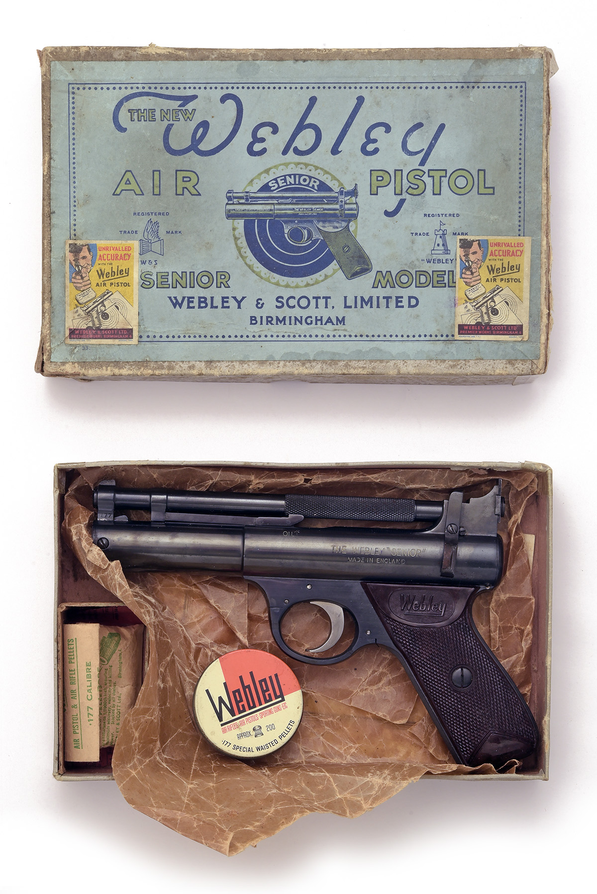 circa 1953, with blued 6 1/2in. barrel, adjustable rear-sight, stirrup barrel latch, blued stepped air-chamber retaining the white paint infill to the model name, three trigger unit without weight adjuster, chequered brown bakelite grips, appearing little used some fading to finish around thumb-latch), together with its manufacturers grey card carton with silver tray and pale blue outer label, instructions inside lid and containing an original cleaning brush, pellet sample, small pellet tin, and spares sheet from November 1956 (taped repairs to lid)
