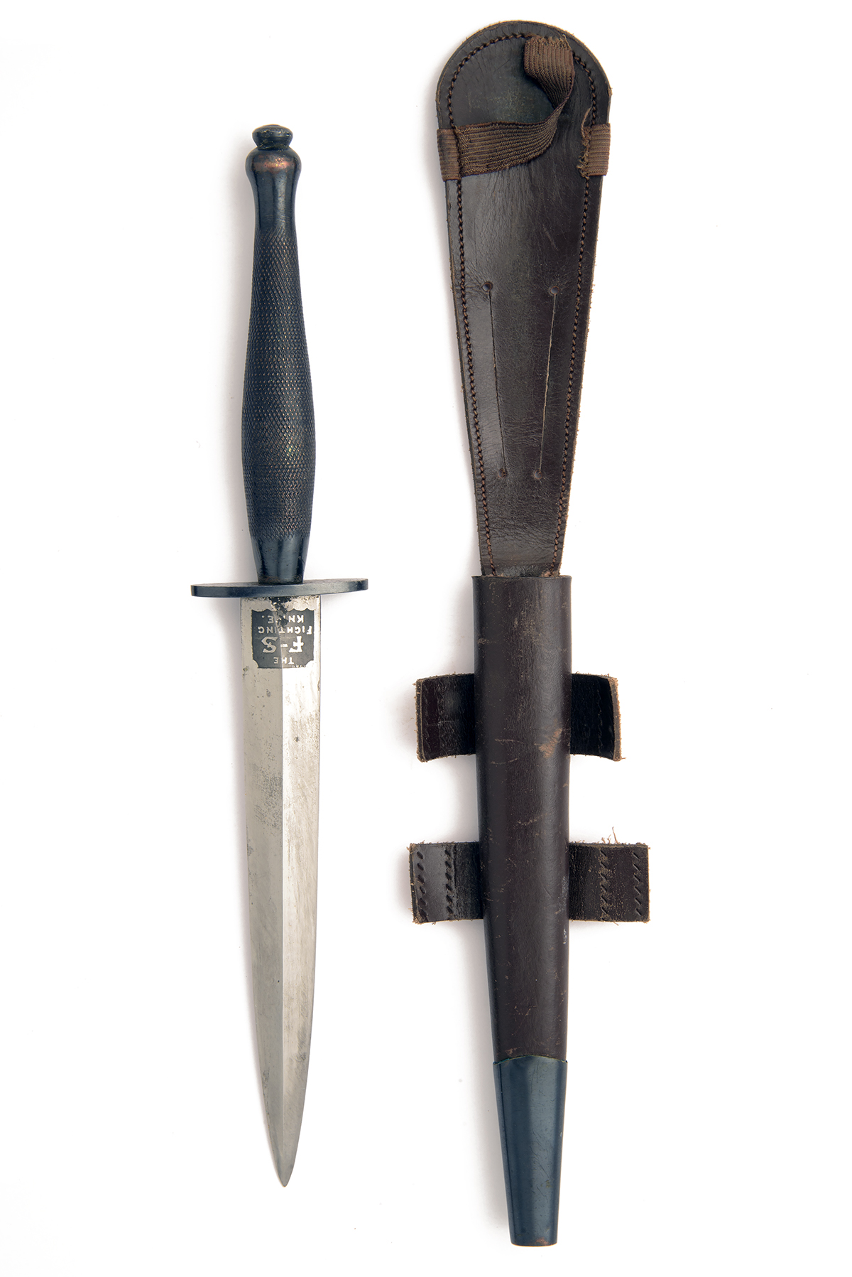 wartime production with 6 5/8in. brushed bright stiletto blade etched with the Wilkinson Sword trademark in a panel at forte, the reverse etched with a similar panel stating 'THE F-S FIGHTING KNIFE', blued oval straight cross-guard, lightly chequered blacked copper alloy hilt swelling towards the forwards section and fitted with a bun nut pommel, some rubbing to finish on high spots and complete with its leather sleeve scabbard with blacked blunt-nose drag and elastic retainer (elastic perished and torn)