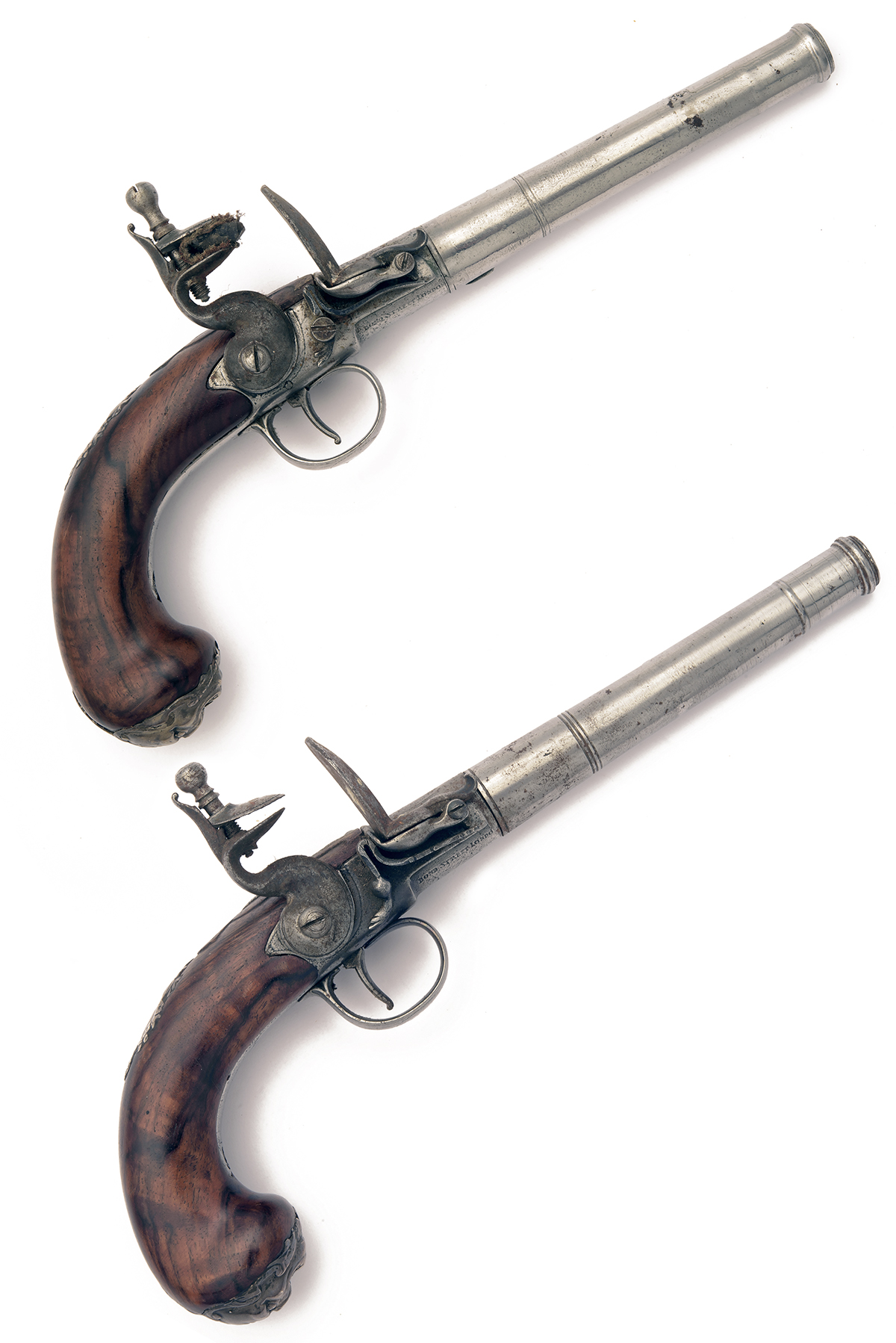 circa 1765, with turn-off tapering 5 1/4in. cannon barrels (one heavily cleaned with loss to detail, the other possibly replaced), traces of London proofs, the top of breech-blocks signed 'GRIFFIN', the undersides 'BOND ST LONDON' (all rubbed), typical side-cock boxlock actions with recumbent 'L' shaped frizzen springs (one cock, both frizzens and one spring replaced), walnut butts with bag-shaped grips (both possibly replaced), white metal rococo escutcheons at wrist, white metal martial trophy sideplates and grotesque mask butt-caps, both trigger guards replaced