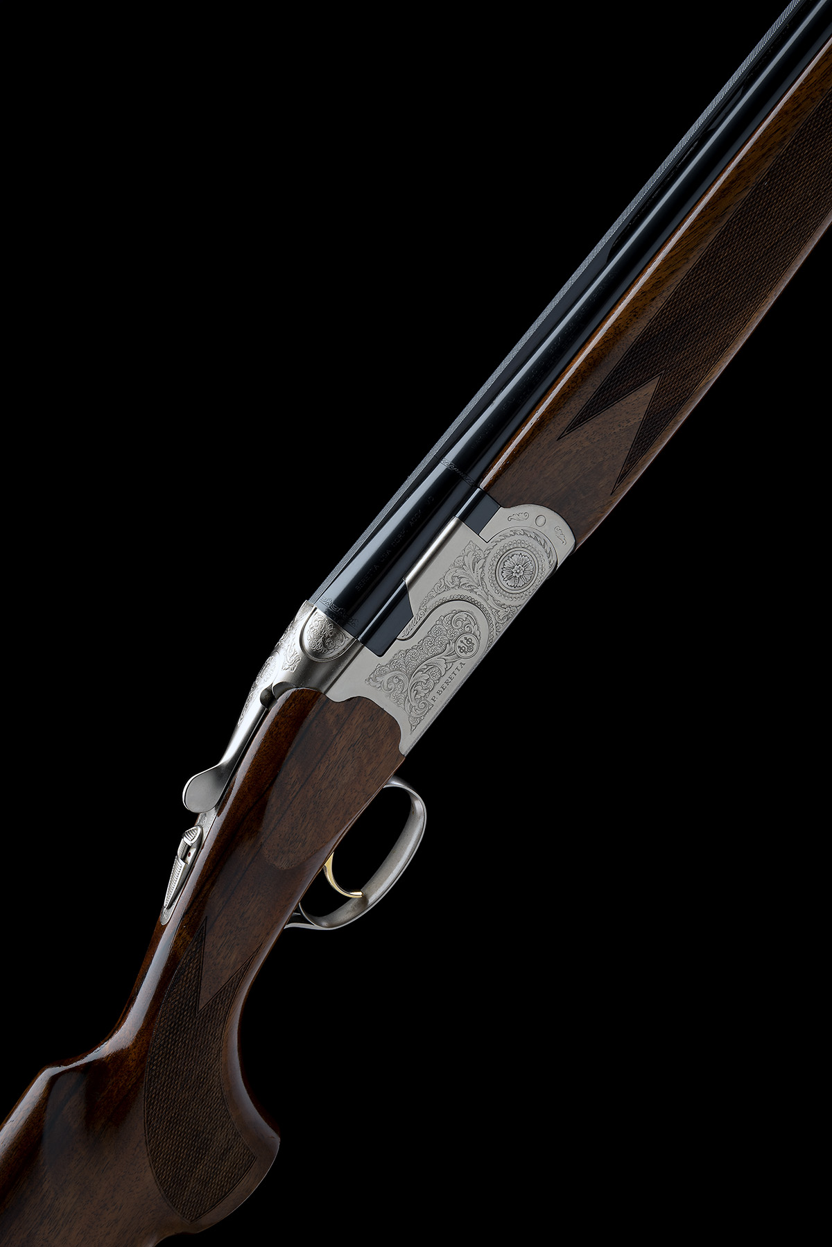 for 2003, 28in. nitro barrels with 6mm ventilated matt top-rib, 3in. chambers, bored approx. 1/4 and 1/2 choke, hold-open toplever, manual safety with integral barrel selector switch, acanthus scroll engraving, bright finish, 13 1/4in. pistolgrip stock cast on for the left shoulder, including 7/8in. rubber recoil pad, (stock shortened, case containing 1 3/4in. off-cut with Beretta rubber buttpad), weight 7lb. 1oz., in its universal case