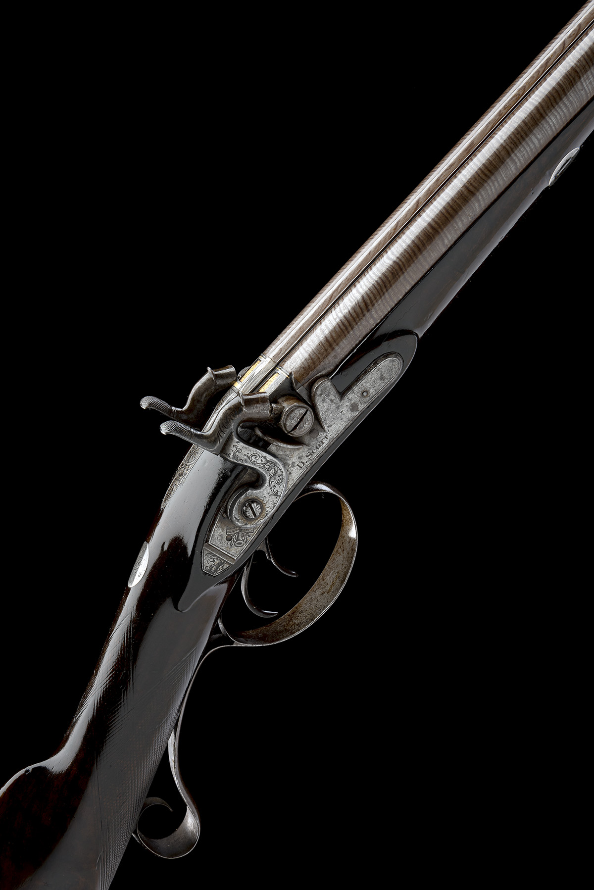 circa 1815 with later conversion to percussion from flintlock, rebrowned 29 1/4in. damascus barrels, both breech-blocks with inlet gold rectangular poincons signed in raised letters 'SCOTT, EDIN'R' and marked with a crown, broad gold lines forward of the fully engraved top-tang, drum-type nipple bosses with screwed vents, flat curved border engraved bevel-edged, step-tailed locks of flint form signed 'D. SCOTT', walnut half-stock chequered at the wrist and with oval white metal escutcheon behind top-tang, iron furniture and brass tipped mahogany ramrod