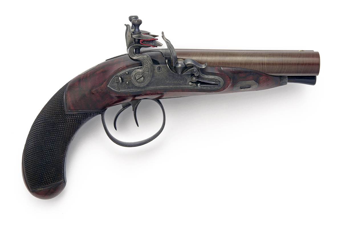 A FINE 28-BORE FLINTLOCK DOUBLE-BARRELLED CARRIAGE-PISTOL, no visible serial number,
