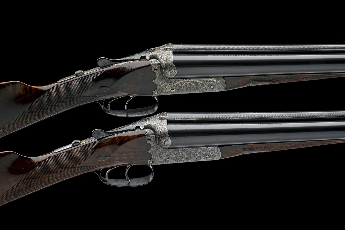 circa 1900, 28in. nitro reproved barrels (in 2013), the tubes engraved 'W.P. JONES. PATENTEE. 25. WHITTALL STREET. BIRMINGHAM. WINNER AT THE LONDON TRIALS OF 12 & 20 BORE GUNS LONDON.' and the ribs gold-inlaid '1' and '2' at the breech ends (No.1 walls below recommended minimum), 2 3/4in. chambers, bored approx. imp. cyl. and 1/4 (both), scroll-back treble-grip actions with sideclips, carved serpentine fences with scrolled termini engraved with a rose, the toplevers gold-inlaid '1', '2', and 'W.P. JONES', intercepting sears, automatic safeties with gold-inlaid 'S' details, bouquet and scroll engraving, the undersides with 'WPJ TRADE MARK', 13 1/2in. figured stocks (possible replacements), the fore-ends with some repairs, weight 6lb. 2oz. (No.1) 6lb. 4oz. (No.2), in their makers brass-cornered oak and leather double guncase