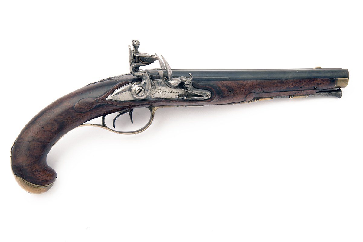 A 36-BORE FLINTLOCK DOUBLE-BARRELLED PISTOL SIGNED 'DORRIES', no visible serial number,