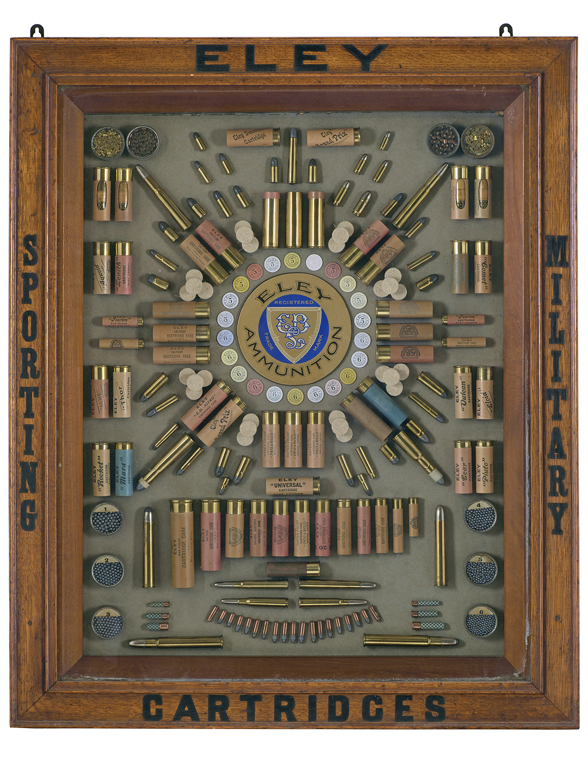 circa 1895, 30 1/2in. x 25 1/4in. oak outer frame (small chips and losses) marked in black 'ELEY' along the top, 'SPORTING' and 'MILITARY' to the left and right sides respectively and 'CARTRIDGES' along the bottom and with a red-painted wooden bevelled inner frame behind the glass, the pale blue background with a raised roundel printed with 'ELEY AMMUNITION' around the 'E.B.L.' central shield, the cartridges displayed in a general starburst formation with metallics to the outer points and bordered by rare trade-name cartridges such as 'Aquoid', 'Zenith', 'Acme', 'Rocket', 'Ecar', 'Eloid', 'Pluto' , Mars' and 'Thor' amongst others, all above a comprehensive display of paper cartridges in all gauges between .360 shotgun to 4-bore shotgun and including rare sizes such as 32-bore, 24-bore and 14-bore and also including cases advertising various powder types such as 'Amberite', 'Ballistite', 'Schultze' and 'E.C.', together with various cut-aways, the metallics including everything from .577-500 downwards to gallery rimfire ammunition, some fading to shell hulls.