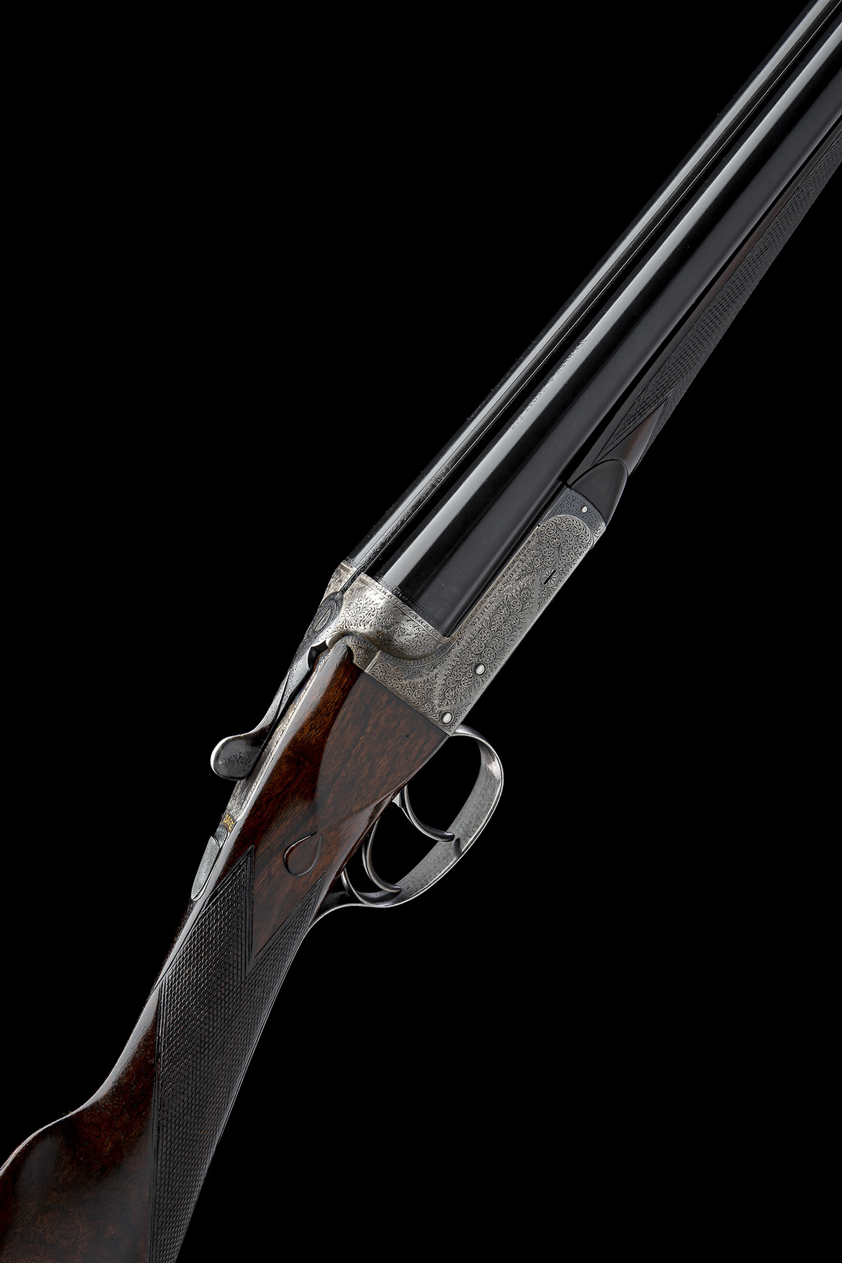 circa 1929, 28in. nitro reproved barrels, tubes engraved 'WEBLEY & SCOTT LTD. LONDON & BIRMINGHAM.', 2 3/4in. chambers, bored approx. 1/4 and 1/2 choke, treble-grip action, removable striker discs, automatic safety with gold-inlaid 'SAFE' detail, border and acanthus scroll engraving, retaining traces of original colour-hardening and finish, 14in. figured stock including buttplate, bolstered fore-end wood, weight 6lb. 3oz.