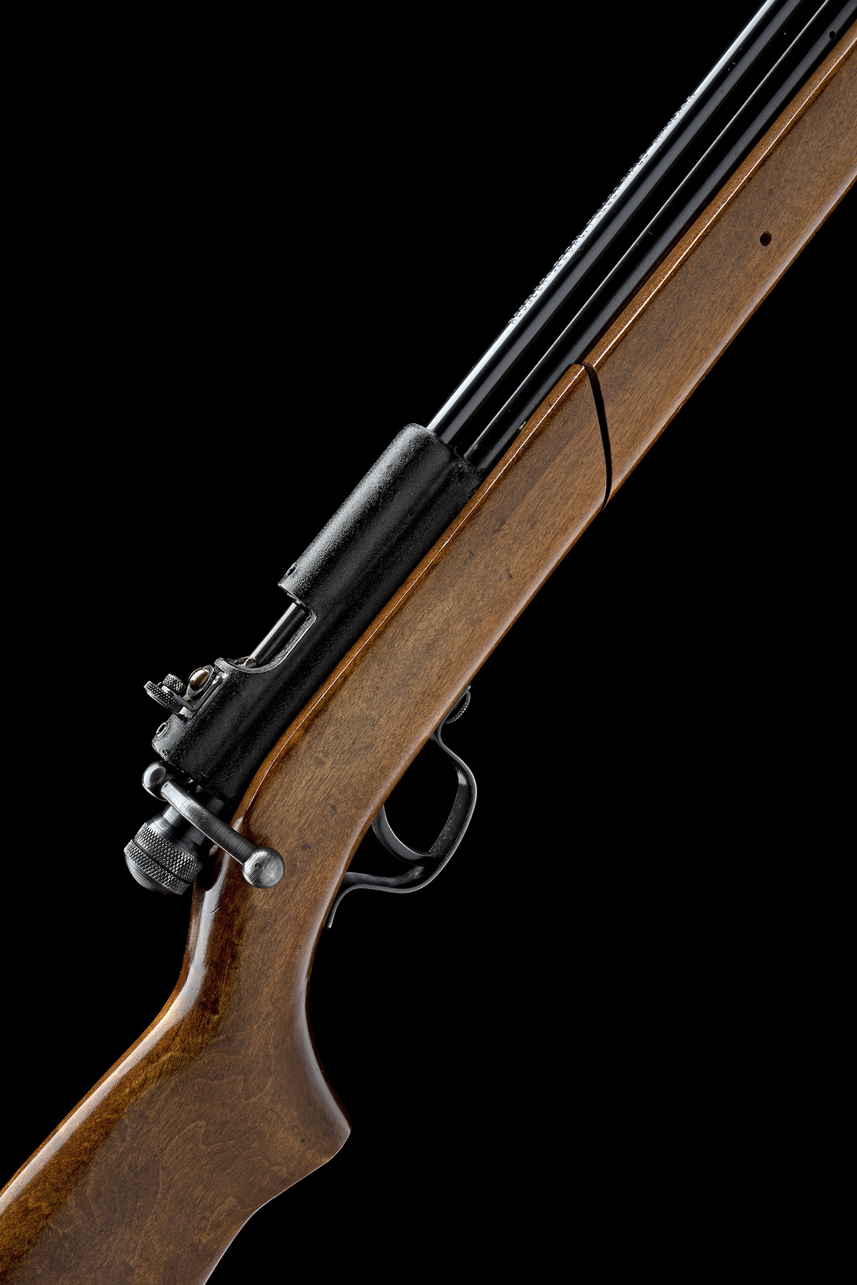 only manufactured between 1948-50, small stock version with blued 20 1/2in. barrel, black crackle-finished bolt action receiver, blade fore-sight, peep rear-sight, beech butt-stock with shaped flush fitting beech fore-end, collectors condition
