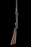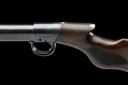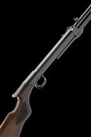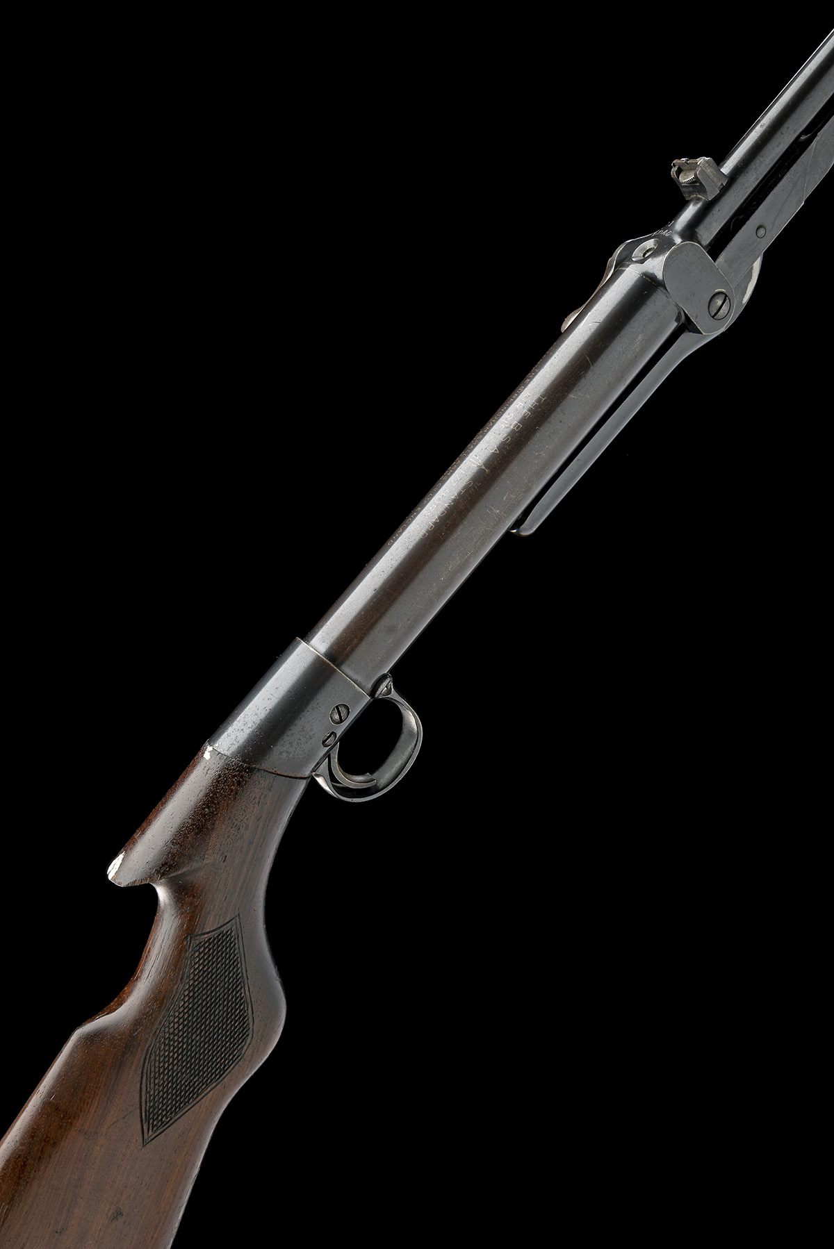 for 1919, the first year of production, with blued 17in. barrel, dove-tailed fore-sight and elevation rear-sight, tap-action breech marked 'LOAD'. plain blued air-chamber etched with 'THE BSA STANDARD AIR-RIFLE .177 BORE (No1)', the legend separated by the 'piled arms' trademark over 'THE BIRMINGHAM SMALL ARMS CO LTD ENGLAND, SOLE MANUFACTURERS' in turn over 'PATENTED' with five countries various patents on three lines (finish lightly faded but completely legible), two-screw trigger unit with cast guard, walnut saw-handled butt-stock chequered at the grip, ribbed finish to heel and push-button under-lever