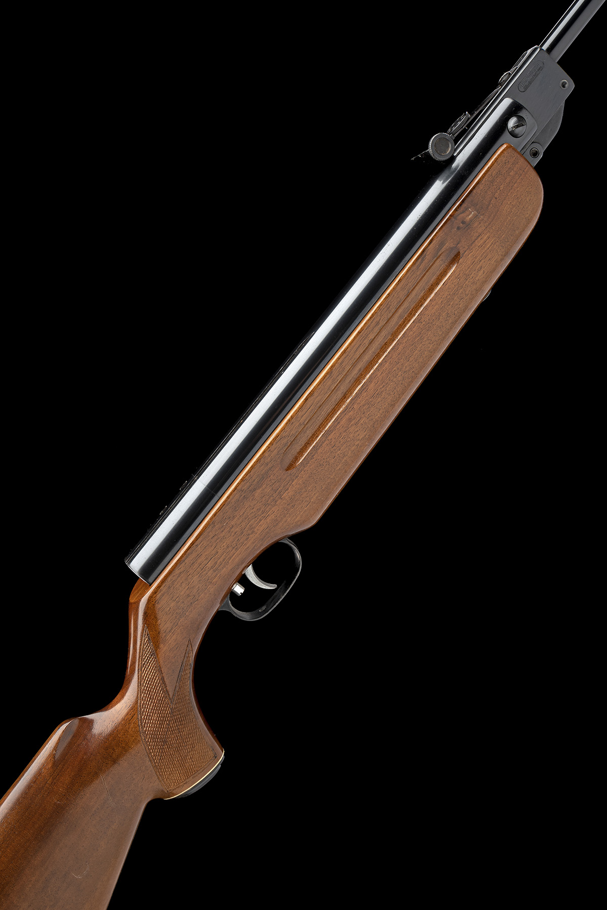 circa 1980 with 22in. 'export' length barrel, tunnel fore-sight, elevating rear-sight with windage adjustment, manual barrel lock at breech, blued air-chamber grooved for a telescopic sight, twin holes for an arrestor-block, automatic safe without indicator, walnut half-stock with capped and chequered pistol-grip, rubber heel-plate, finger-grooved fore-end and factory fitted with swivels for sling, some light marks to wood but appearing little used