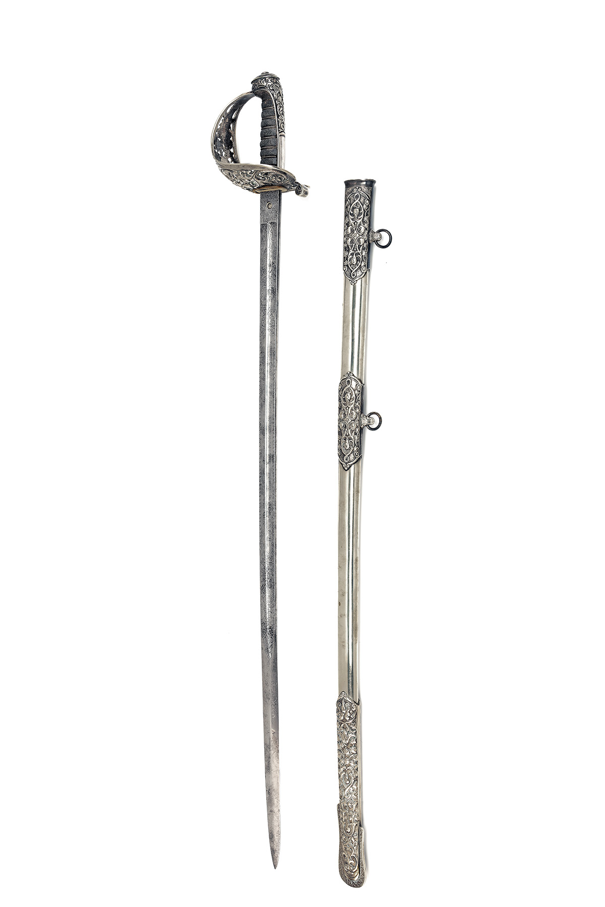 dated 1862, with 34in. slightly curved single-edged nickel-steel blade with single fuller ending 11in. from the point, the last 11in. of the blade being double-edged, finely etched with foliate scroll-work, VR and crown royal cypher, with scroll-work, angel holding a bow and arrow, and a central presentation panel with the inscription 'PRESENTED TO CAPTAIN AND ADJUTANT KEATING BY HIS BROTHER OFFICERS AND A / FEW FRIENDS ON HIS RESIGNING THE ADJUTANCY OF THE BRIGADE L.A.V. NOVbr 19th 1862', ricasso marked 'PULLIN / Maker / LONDON', with brass 'PROVED' plug over, white metal hilt cast with scrolls and foliate design enclosing the union rose and thistle spray, black fish-skin grip bound with white metal wire, decorative cast back-strap and pommel, together with its (presumed) silver-plated brass scabbard with three deeply cast and chased white metal mounts with two suspension loops, small edge knock to the scabbard between the two loop-mounts